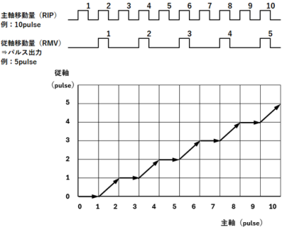 次は、主軸移動量(RIP)10pulseに対し従軸移動量(RMV)5pulseを出力する例です。従軸移動量の5pulseが図の間隔で出力します。