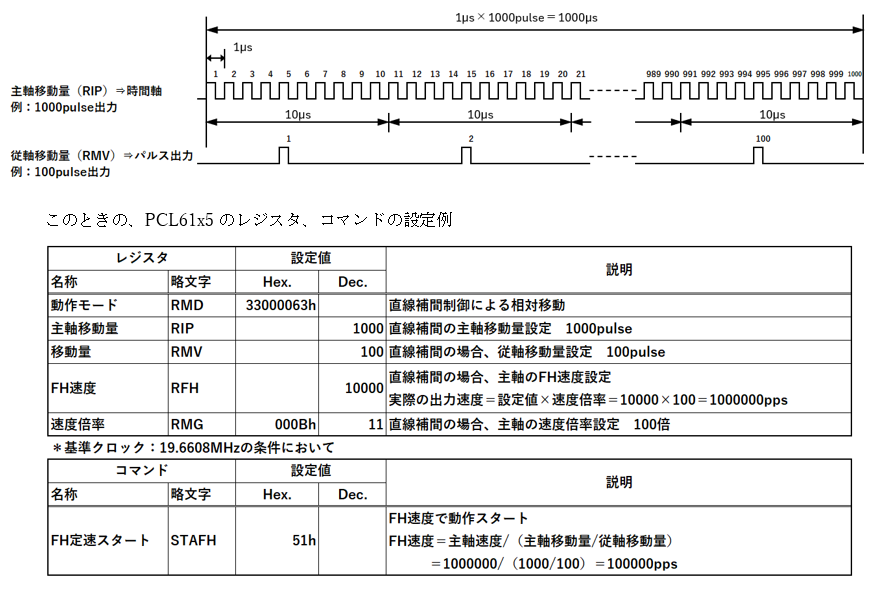 主軸が1000pulseを移動するには、1μs×1000pulse=1000μsの時間がかかることになり、従軸移動量を100pulseとすると、1000μsの時間に一定間隔で100pulse出力します。