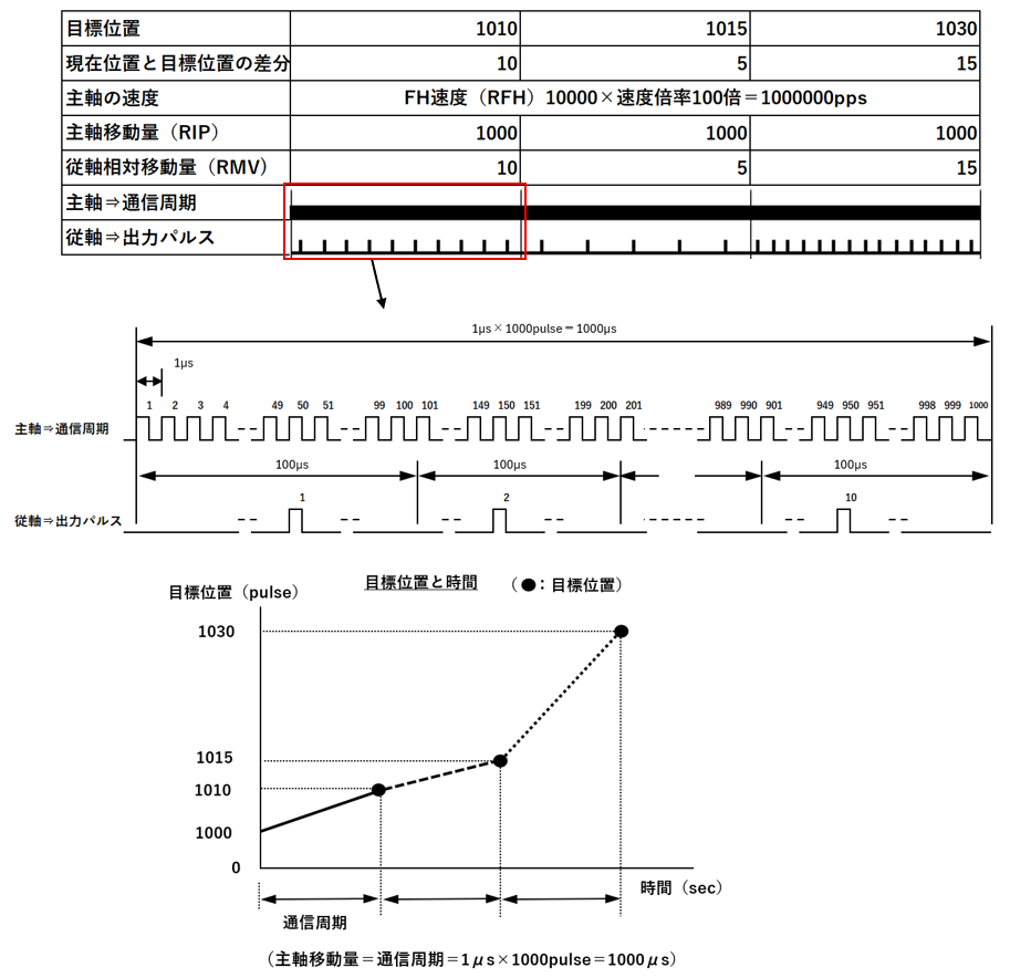 この例では、主軸の速度1000000ppsで主軸移動量(RIP)1000pulseを設定し1μs×1000pulse=1000μsを動作サイクル時間とし、これを通信周期と一致させ、従軸の移動量を(RMV)に目標位置と現在位置の差分を設定することで1000μs毎に目標位置、1010、1015、1030へと動作させます。