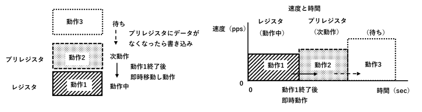 動作1が動作中に、プリレジスタに動作2を書き込んでおくと動作1が終了後、停止することなく動作2が開始されます。