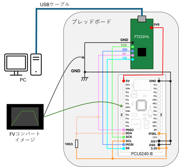 ハードウェアの接続は、[PC] – [USB] – [SPI変換モジュール] – [PCL6240-B]という構成になっており、